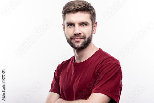 Powerful position. The portrait of a charming young man in a burgundy t-shirt standing half-turned and folding his arms across his chest while posing isolated on a white background