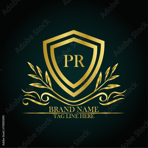 PR luxury letter logo template in gold color. Elegant gold shield icon. Modern vector Royal premium logo template vector
