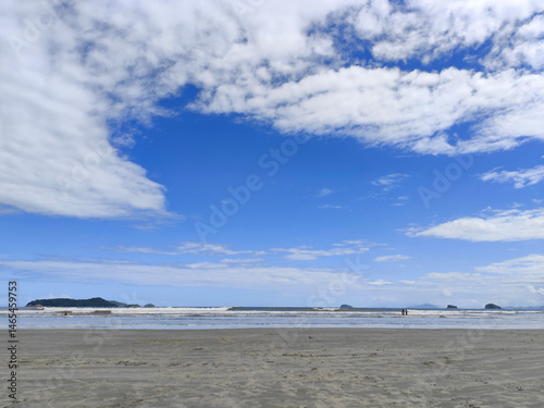 Praia da Fazenda - Ubatuba SP. A beautiful beach with fine and wavy sand, reflecting the gentle waves of the sea under a clear blue sky full of white clouds.