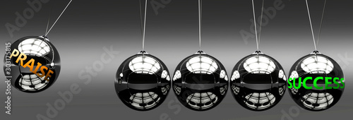 Praise and success - the idea that Praise helps to achieve success and happiness in business, work and life symbolized by English word Praise and a newton cradle, 3d illustration