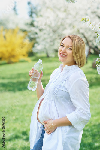 pregnant woman drinks water. Became ill in the heat. drinking balance during pregnancy. drinking water bottle of water in her hand in pregnant diet