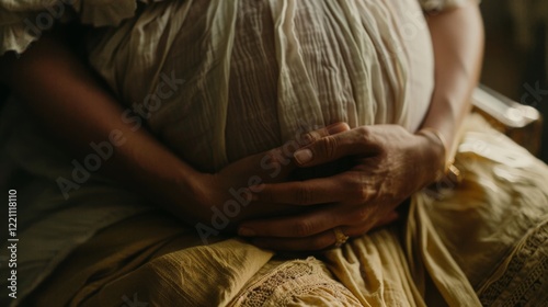 pregnant, woman, belly, hand, dim, female, caucasian, adult, maternity, pregnancy, nurturing, gentle, tender, waiting, anticipation, expecting, care, mother, unborn, life, creation, hugs, protective, serene, calm, love, warmth, family, journey, motherhood, future, new, soft, light, shadow, glow, peace, moment, bond, connection, delicate, yellow, lace, garment, touch, finger, folded