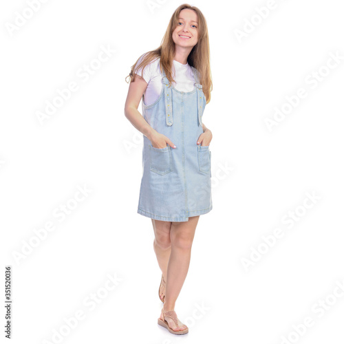 Pregnant woman in denim sundress goes walking looking smiling on white background isolation