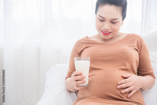 Pregnant woman sitting on bed ,holding a glass of milk and smiles.Focus at milk glass and pregnant belly.