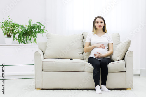 pregnant, touching, white background, sofa, sitting, facial expression, idea, inspiration, human face, eltern, stomach, smiling, looking, mother, abdomen, living room, anticipation, eye, cushion, background, white color, waiting, one person, happiness, relaxation, nose, neck, photo, hand, domestic life, cosy, comfortable, creativity, casual clothes, clothing, hair, human lips, human hand, excitement, new life, mouth, finger, home interior, family, cute, lifestyle, female