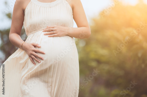 Pregnant woman touching her big belly and walking in the park relaxing in outside