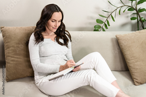 pregnant woman writes in notebook in gray blouse sitting on couch, makes list