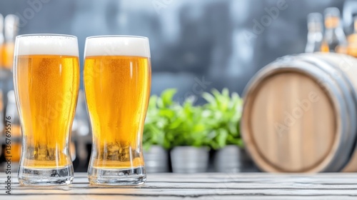 Premium Amber Beer Served in Glasses with Classic Wooden Barrel Background