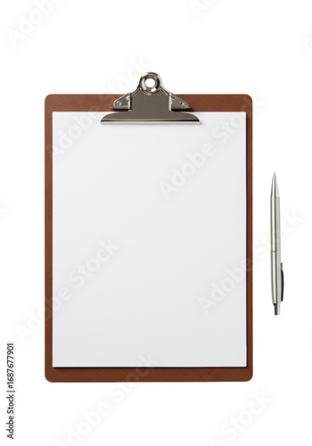 Premium brown professional clipboard, crisp blank paper & silver pen, meticulously arranged on transparent studio background, flat lay. Concept of professionalism and efficiency