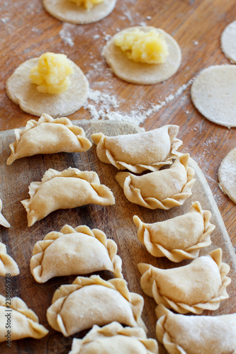 board, closeup, cooking, cookery, dinner, dish, dough, dumpling, flour, food, fresh, healthy, homemade, ingredient, italian, chinese, russian, lunch, meal, preparation, ravioli, raw, rustic, table, tortellini, traditional, wooden, circle, closeup, making, cutting, siberian, brown, mashed, potato, copy space