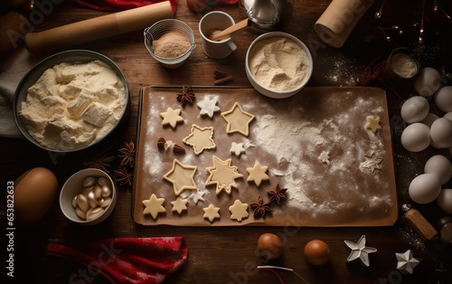 food, christmas, homemade, flour, sweet, cookie, holiday, cooking, preparation, celebration, dough, background, pastry, kitchen, tradition, gingerbread, dessert, table, baking, bakery, ingredient, winter, shape, decoration, biscuit, wooden, star, christmas, delicious, brown, cake, festive, tasty, closeup, spice, rolling, anise, raw, white, season, egg, wood, receipe, cinnamon, nobody, board, ai