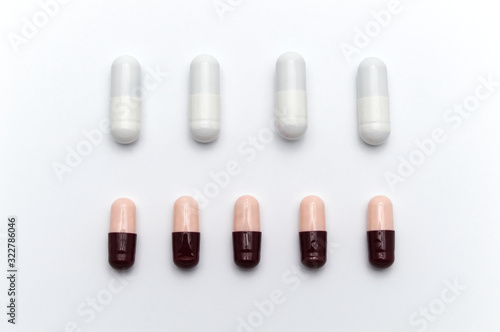 Prescription drugs, capsules of different colors between white capsules and dark reddish brown and soft pink all mix in . On white background.