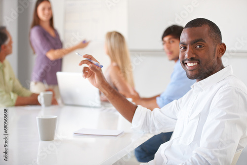 Presentation question, business portrait and happy black man listening to sales pitch, proposal or negotiation meeting. Startup project workshop, smile and African agent with brainstorming idea group