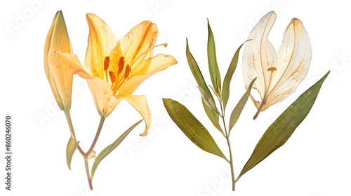 Pressed and dried delicate Lilies Lilium Lily flower and leaves isolated from background For use in scrapbooking floristry or herbarium : Generative AI