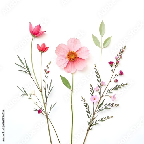 flower, pink, red, green, leaf, stem, floral, blossom, bloom, flower petals, plant, nature, topview, white background, simple, clean, delicate, soft, gentle, beautiful, lovely, fresh, natural, botanical, arrangement, display, collection, group, several, single, flower head, leaf, tree branch, small, tiny, pretty, light, bright, pastel, pressed, still life, minimal, design, floral pattern, organic, spring