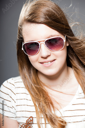 Pretty brunette teenage girl with sunglasses. Studio shot.