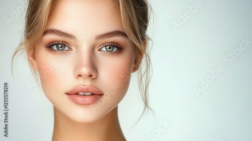 pretty Caucasian woman with radiant flawless skin, facial and skincare beauty industrial model portrait on soft light background