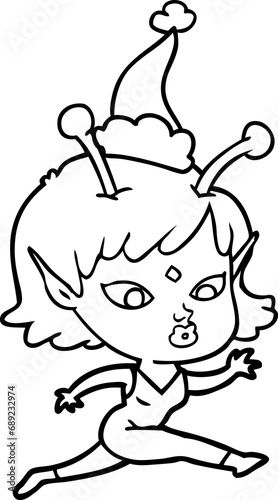 pretty hand drawn line drawing of a alien girl running wearing santa hat