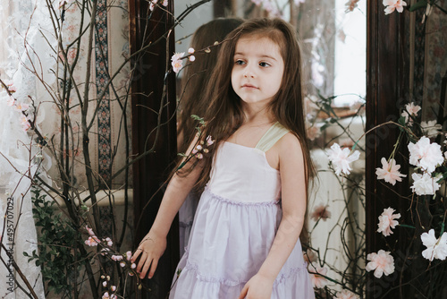 pretty little Armenian girl having fun on veranda on sunny spring day decorated with flowers and Easter decor, willow branches, Easter family celebration