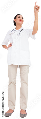 one person, young adult, woman, female, caucasian, practitioner, profession, professional, specialist, uniform, health care, medicals, nurse, tunic, stethoscope, happy, smiling, cheerful, pointing, touching, gesture, signs, finger, showing, hand, presenting, pressing, presentation, pretty, beautiful, brown hair, brunette