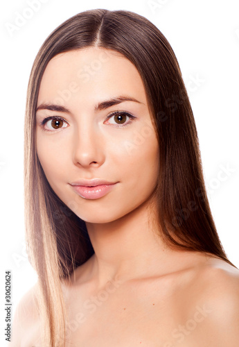indoor, isolated, white, background, studio, closeup, portrait, caucasian, female, young adult, girl, healthy, make-up, beauty, beautiful, brunette, long hair, pretty, cute, cheerful, happy, happiness, one person, posing, attractive, face