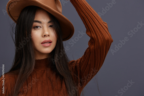 pretty woman brown sweater glamor posing smile fashion isolated background