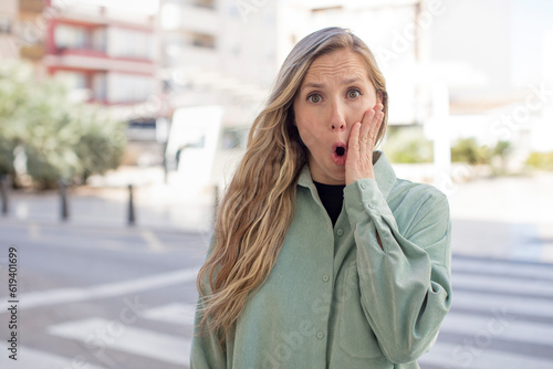 pretty woman feeling shocked and astonished holding face to hand in disbelief with mouth wide open
