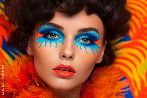 pretty woman in orange carnival costume with blue eye makeup created with Generative AI technology