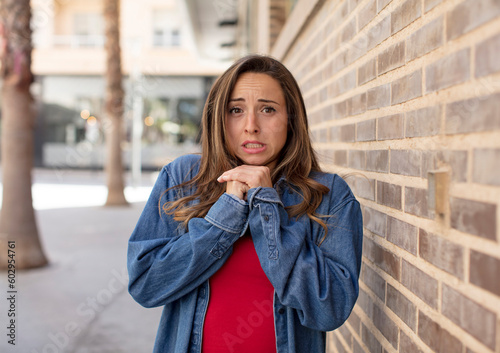 pretty woman looking worried, stressed, anxious and scared, panicking and clenching teeth