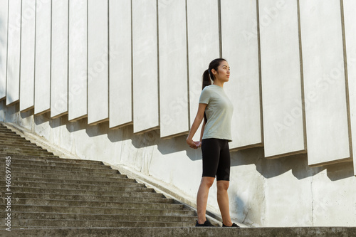 Pretty young Asian woman in stylish tracksuit stretches arms behind back near wall with concrete decor on sunny city street