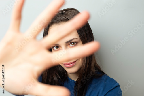 Pretty young woman covers her face with her hand.