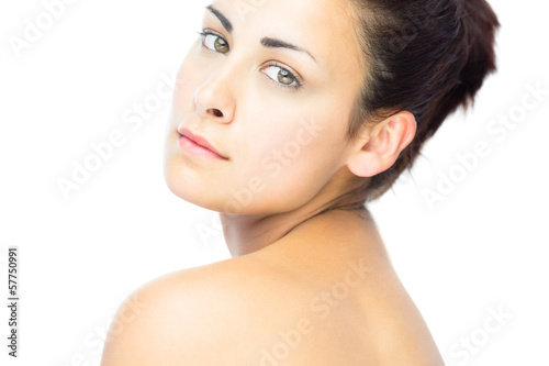 20s, young adult, woman, female, caucasian, white background, cut-out, isolated, cute, pretty, gorgeous, attractive, beautiful, beauty, clean, fresh, freshness, charming, slim, fit, model, natural, honed, purity, wellness, shoulder, skin, skincare, posing, brown hair, brunette, calm, peaceful, naked, naked, bare, portrait