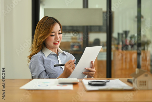 Pretty young woman sitting at her office desk and checking financial reports
