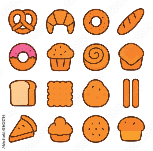 Pretzel & Baked Goods modern flat style . Pretzel, Croissant, Bagel, Baguette, Doughnut, Muffin, Cinnamon roll, Danish pastry, Bread slice, Biscuit, Scone, Breadstick