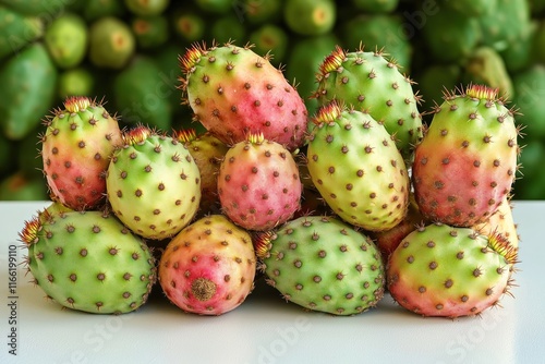 Prickly pears on white surface. Colorful cactus fruits stacked together. Ready for harvest display. Fresh, vibrant. Agricultural product. Healthy food. Colorful fruit. Exotic plant. Possible use for