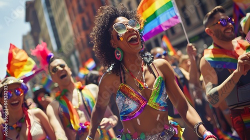 Pride parade with colorful flags and joyful participants celebrating in a lively urban setting