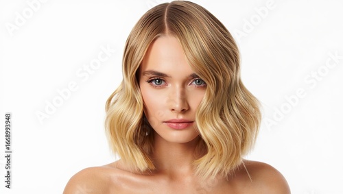 Primer Plano de Modelo Femenina con Peinado Bob Rubio Moderno y Tez Impecable, Mirada Confiada y Expresión Serene, Sugiriendo Elegancia y Tendencias Actuales de Belleza