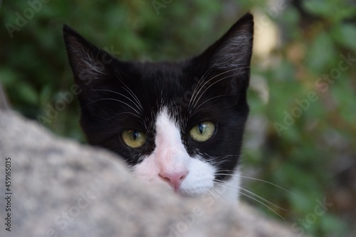 primo piano sugli occhi di un gattino bianco e nero