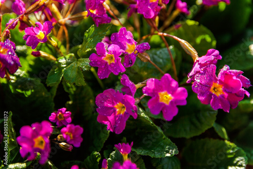 Primrose Primula with pink flowers. Inspirational natural floral spring or summer blooming garden or park under soft sunlight and blurred bokeh background. Colorful blooming ecology nature landscape