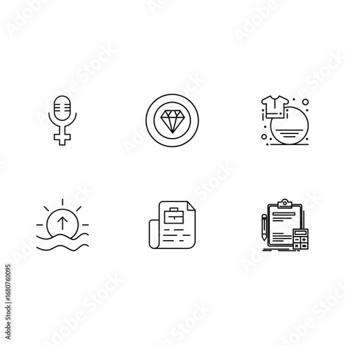 icon, set, vector, graphic, design, symbol, illustration, business, microphone, audio, podcast, diamond, gem, gem, clothes, laundry, sunset, sunrise, sun, wave, ocean, document, paper, contract, agreements, clipboard, note, calculating machine, crayons, planning, outline, minimalist, black, white, art, digital, web, creative, isolated, nourishment, training, scenery, future