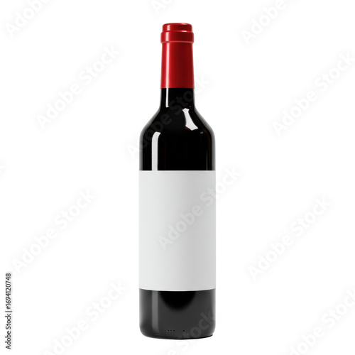Pristine, elegant dark glass bottle with vibrant metallic red foil cap and blank matte label, isolated on transparent studio background, concept for premium product branding
