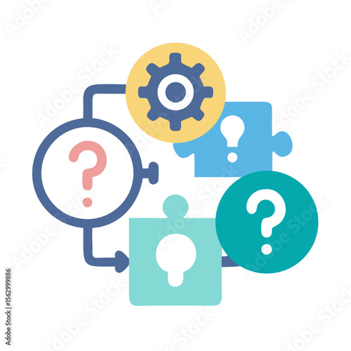 question, solution, teamwork, puzzle, cogwheel, connection, process, strategy, innovation, idea, light bulb, collaboration, design, vector, flat, illustration, circle, square, blue, yellow, turquoise, pink, outline, black, background, graphic, concept, geometric, shape, together, cooperation, brainstorming, engineering, technology, system, development, progress, growth, symbol