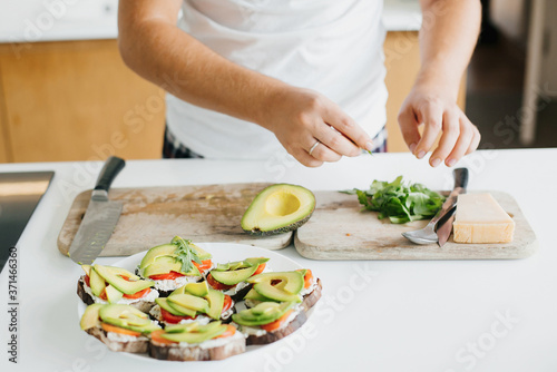 Process of making toasts with avocado on modern white kitchen. Hand putting arugula on sandwich made of whole grain bread, avocado, tomato, and cheese. Home cooking concept