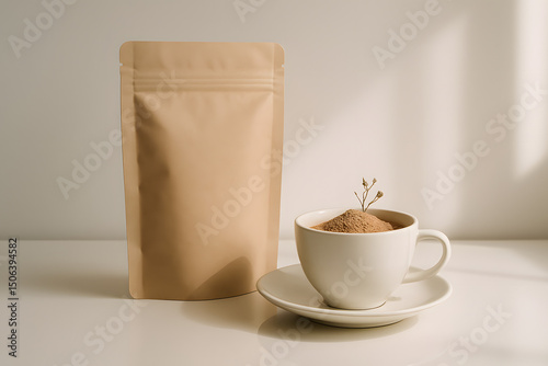 Product Presentation: A minimalist studio shot of a product, featuring a natural kraft paper bag and a cup, creating a balanced composition to showcase design and substance.