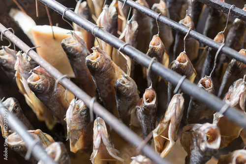 smoked, fish, production, food, herring, background, healthy, natural, fresh, sea, ocean, industry, tasty, seafood, processing, preparation, factory, rack, technology, shiny, view, group, metal, traditional, organic