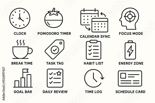 clock, timer, calendar, sharpened, break, task, habit, energy, goal, review, log, schedule, sync, mode, tags, bar, time, list, zone, card, management, efficient, productivity, organisation, planning, reminder, checklist, system, process, workflow, tracking, optimization, strategy, framework, vector, icon
