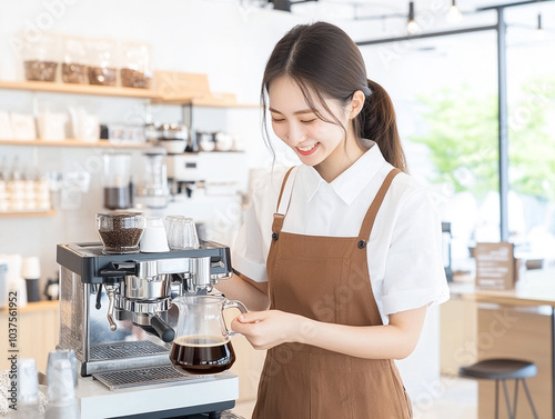 Professional barista preparing coffee using chemex pour over coffee maker and drip kettle.
