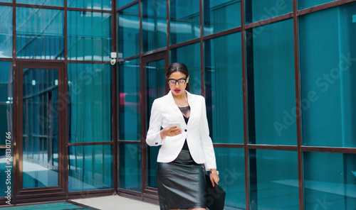 Professional business afro woman in elegant white jacket and skirt with folder with documents in her hands use smartphone against the background of business center with blue windows