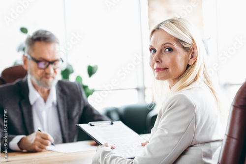 Professional business meeting with a confident senior businesswoman and businessman reviewing documents