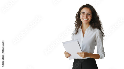 Professional business woman,smiling and holding documents,white background,copy space,web banner.